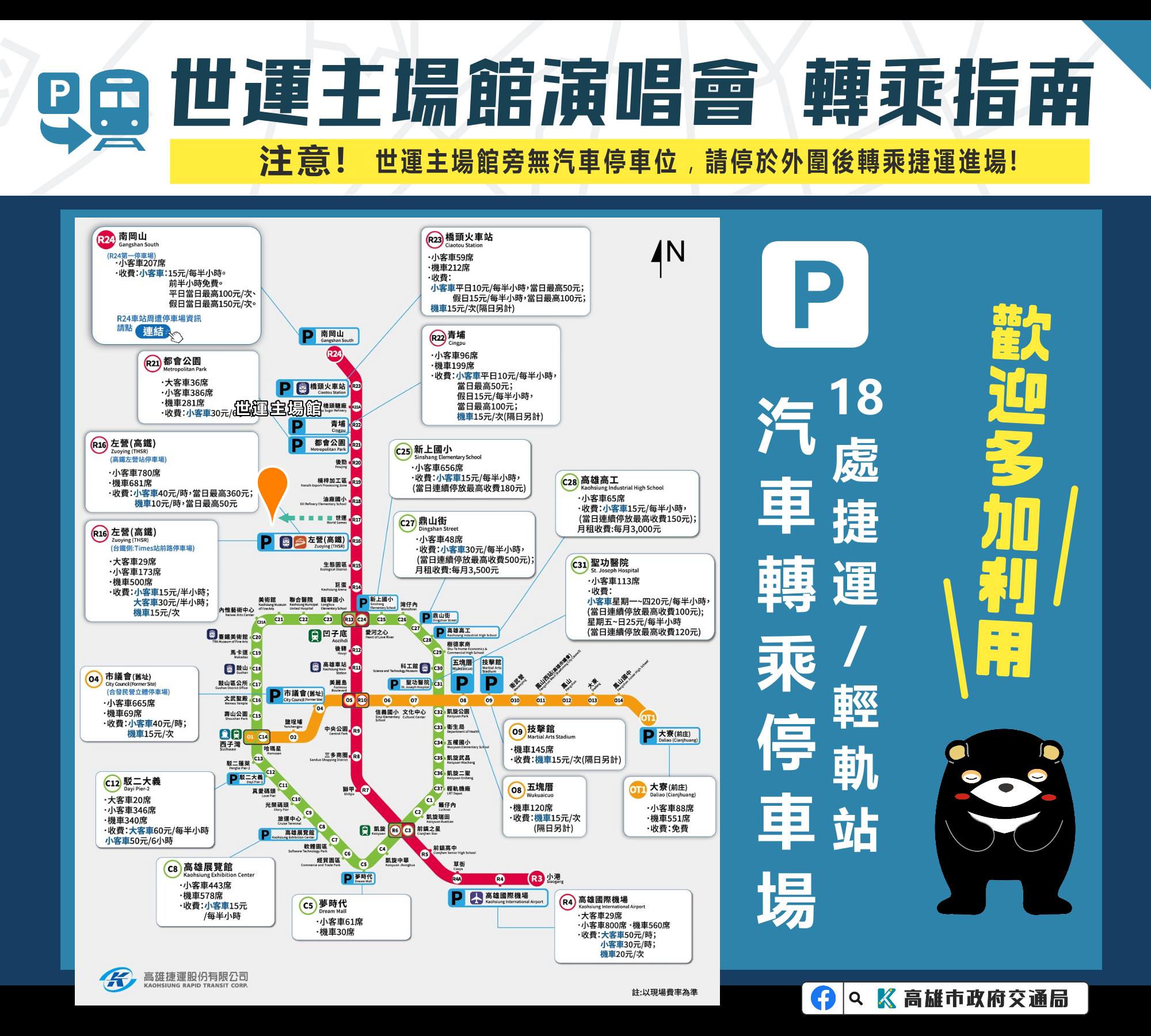 交通局也呼籲,參加演唱會活動請盡量搭乘公共運輸,「搭捷運、不開車、少騎車、走路最健康」,管制期間會場周邊道路均禁止臨時停車,有接送需求的民眾,請多加利用外圍捷運臨停接送,再搭捷運至紅線 R17 世運站出站,步行 5~8 分鐘即可抵達演唱會場。此外,主辦單位安排免費接駁專車,13時至19時提供「高鐵左營站/台鐵新左營站-演唱會場」進場接駁車服務、21時至22時30分提供「演唱會場-高鐵左營站/台鐵新左營站」散場接駁車服務。散場疏運部分,D、E出口歌迷直接步行至R18油廠國小站距離較近外,捷運公司已規劃提高捷運疏運量能,縮短班距為3~4分鐘。