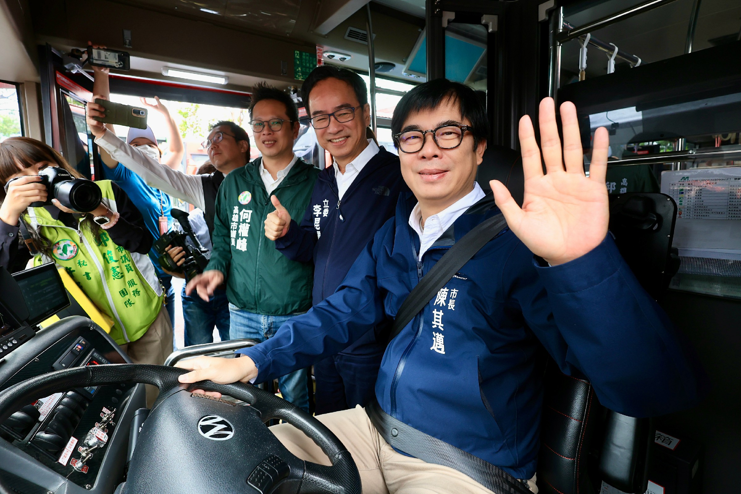 ↑圖說:陳其邁試乘電動公車(圖片來源:高雄市政府提供)