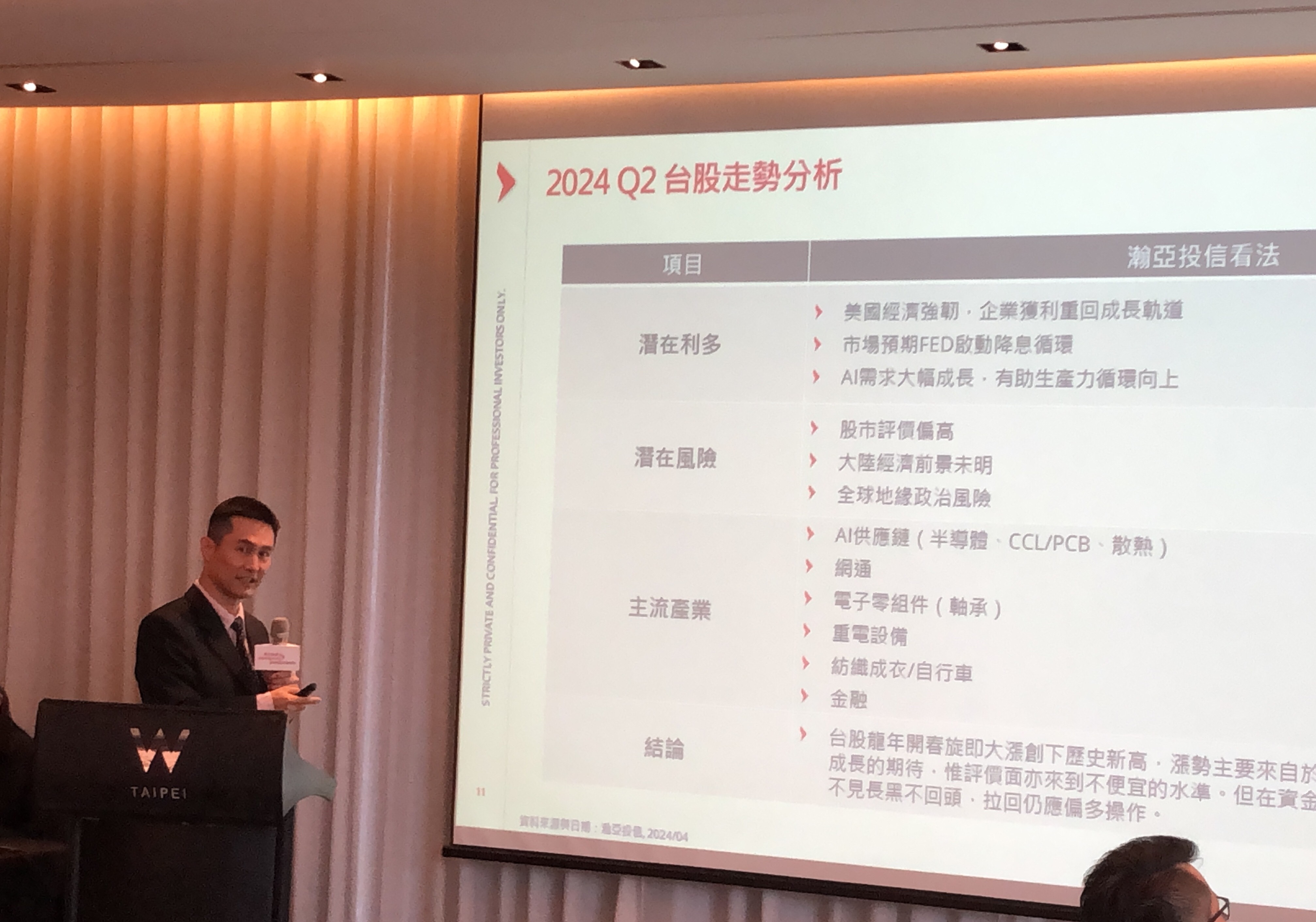 瀚亞投信國內投資部主管姚宗宏表示,市場資金過度集中在AI相關等族群,產業仍存在著淡季效應,預估指數維持高檔環境下,類股輪動較快速,盤勢將會持續震盪,靜待下半年復甦環境較為明確時,台股有望掀起新一波行情。