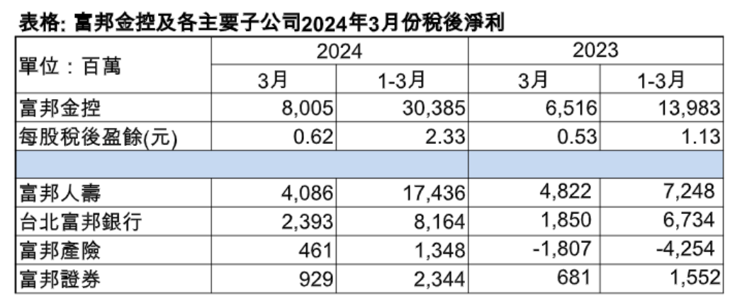 子公司台北富邦銀行及富邦證券單月及累計前3月稅後淨利,皆創下歷年同期新高。