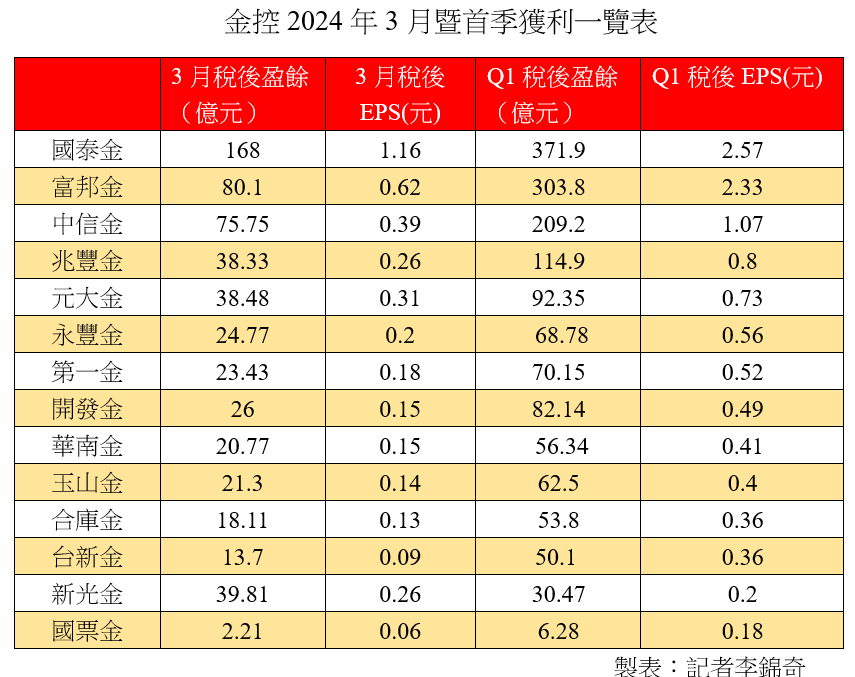 獲利冠軍:國泰金,3月稅後淨利168億元,累計稅後淨利371.9億元,創歷史次高,各子公司核心業務動能強健,獲利表現亮眼,包括國泰世華銀行、國泰產險、國泰證券及國泰投信,累計稅後淨利皆創歷史新高。