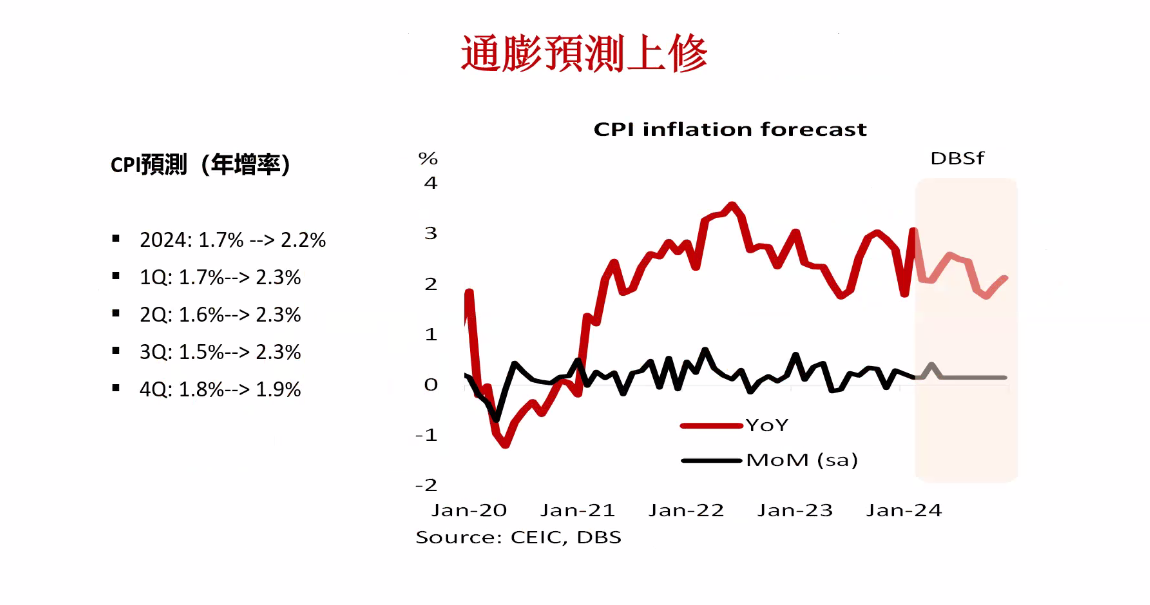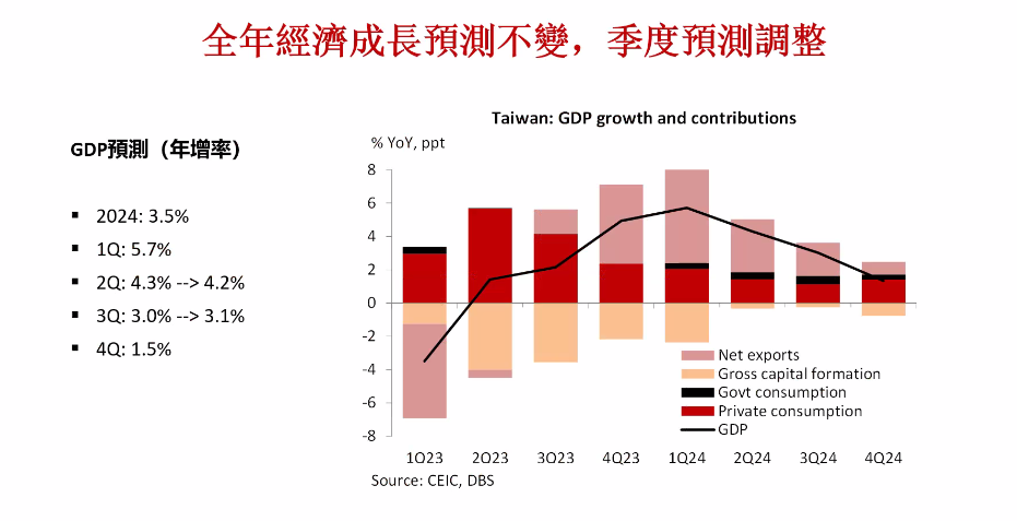 星展集團資深經濟學家馬鐵英指出,對台灣第三季GDP預測,從3%上調至3.1%。與年初相比,預測的主要變化在於通膨。2024年CPI預測由之前的1.7%調整至2.2%;預計第二季CPI將維持在2.3%。