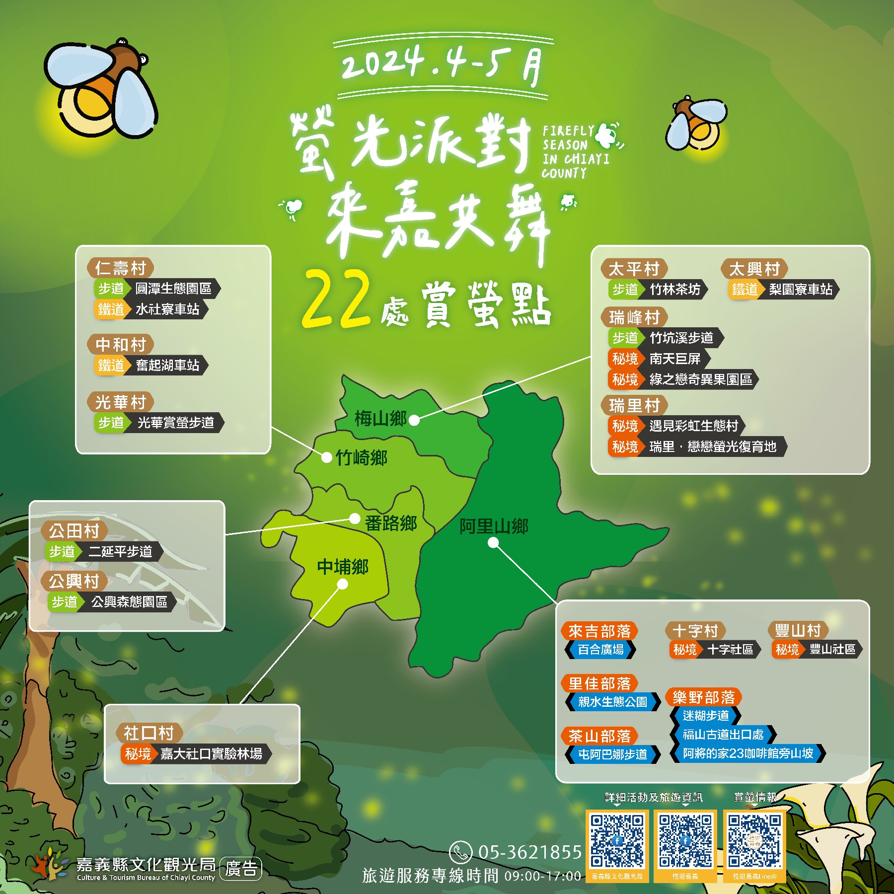 想了解嘉義縣螢火蟲季活動資訊,可以加入「慢遊嘉義」官方Line@(@chiayitravel),掌握最新的賞螢點、餐飲及住宿等資訊,更多旅遊資訊可至慢遊嘉義粉絲專頁或Instagram查詢。