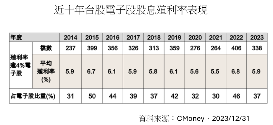電子股獲利配息能力,一向吸引台灣投資人目光,根據Cmoney統計,近十年(2014-2023)各年度股息殖利率超過4%的電子股檔數,多達200-400檔左右,平均殖利率約6%,占比約是整體電子股的3-5成。