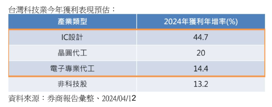 根據券商預估,IC設計今年獲利年增率高達44.7%,晶圓代工20%,電子代工14.4%,都高於非科技股的13.2%。