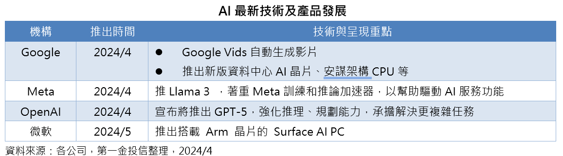 AI技術、產品不斷有新進度傳出,像是Google Cloud Next 大會宣布推出多項AI新功能,包括:Google Vids自動生成影片,推出新版資料中心AI晶片、安謀架構CPU等;此外,Meta也推出新款自行研發晶片,Meta訓練和推論加速器,幫助驅動人工智慧(AI)服務功能;OpenAI可望強化ChatGPT推理、規劃能力,將推出GPT-5;微軟則預計在5月推出搭載 Arm 晶片的 Surface AI PC等。