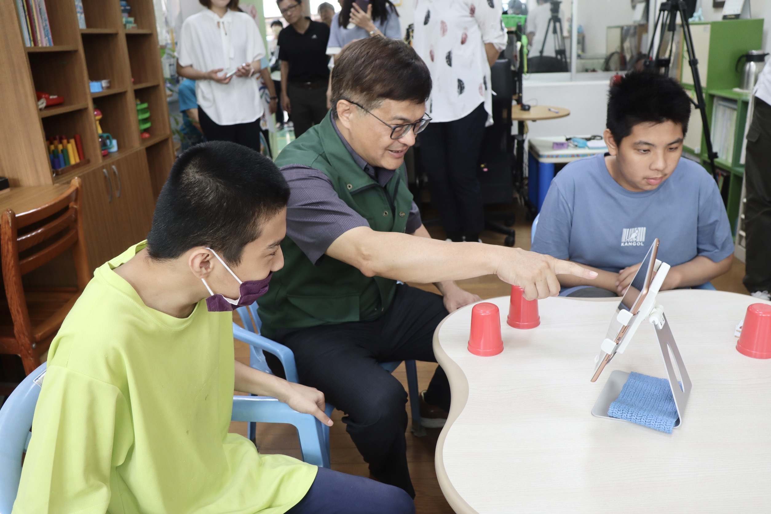 ↑圖說:謝文斌(左二)關懷特教生學習情形。(圖片來源:高雄市教育局提供)