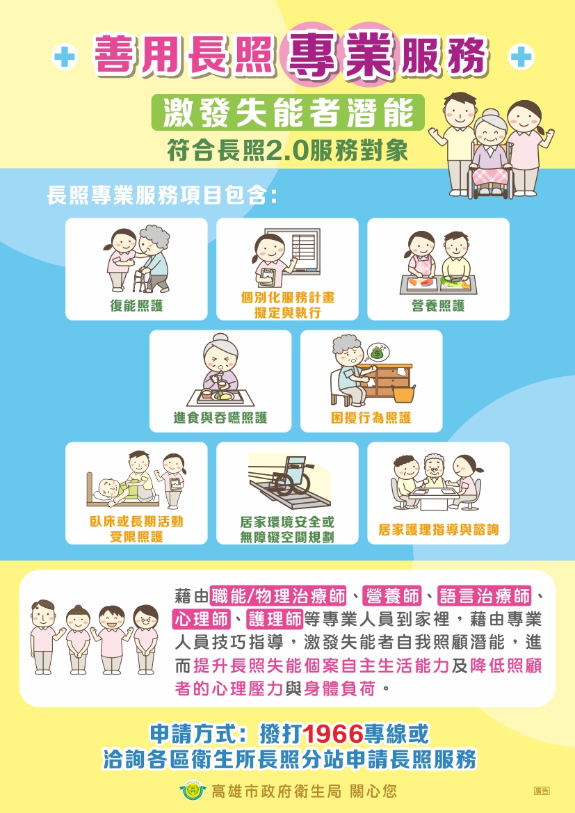 為提升長照失能個案的生活能力,減少對照顧者的依賴,高雄市政府衛生局鼓勵使用專業服務,醫事人員依個案及家屬的需求,共同討論想恢復的生活目標,指導個案、照顧者學習活動技巧。訓練內容可包含行走及洗澡訓練、營養餐食照護、傷口照護等,期望在最短時間提升個案自我照顧能力及生活品質,降低照顧者照顧負荷。