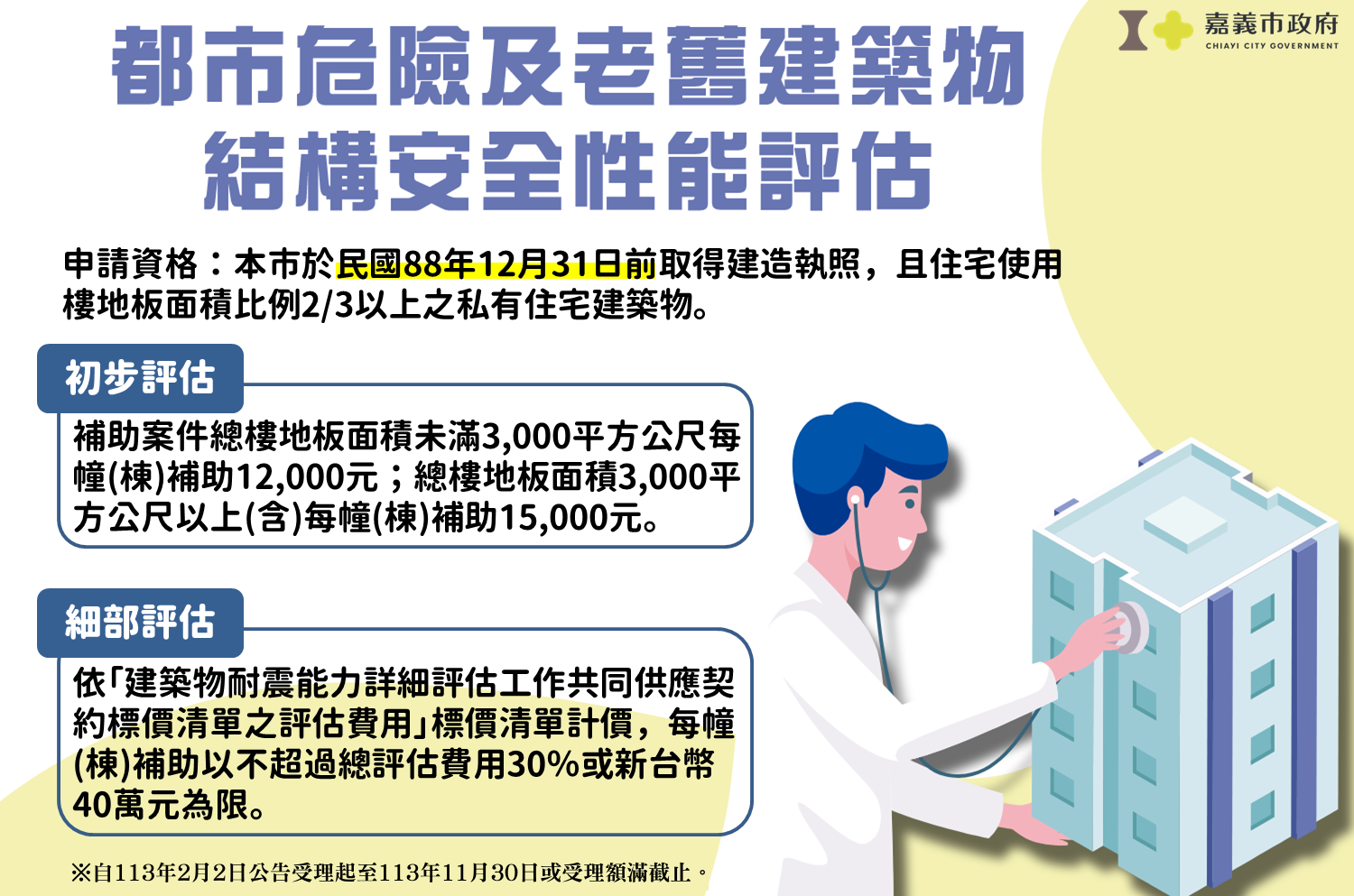台灣位於歐亞板塊與菲律賓海板塊上,地震頻繁,平時就應具備「居安思危、防災應變」的能力方為防止災害損失的最大保障。嘉義市工務處表示為協助市民瞭解私有住宅耐震能力,維護建築物公共安全與推廣建築物防震觀念,市府辦理113年度「全國建築物耐震安檢暨輔導重建補強計畫」,113年2月2日起針對88年12月31日前取得建造執照之合法建築物申請耐震能力評估以及公寓大廈建築物結構補強措施補助,初步評估每棟最高補助1萬5千元、詳細評估每棟最高補助40萬元,鼓勵市民朋友踴躍申請參與評估。