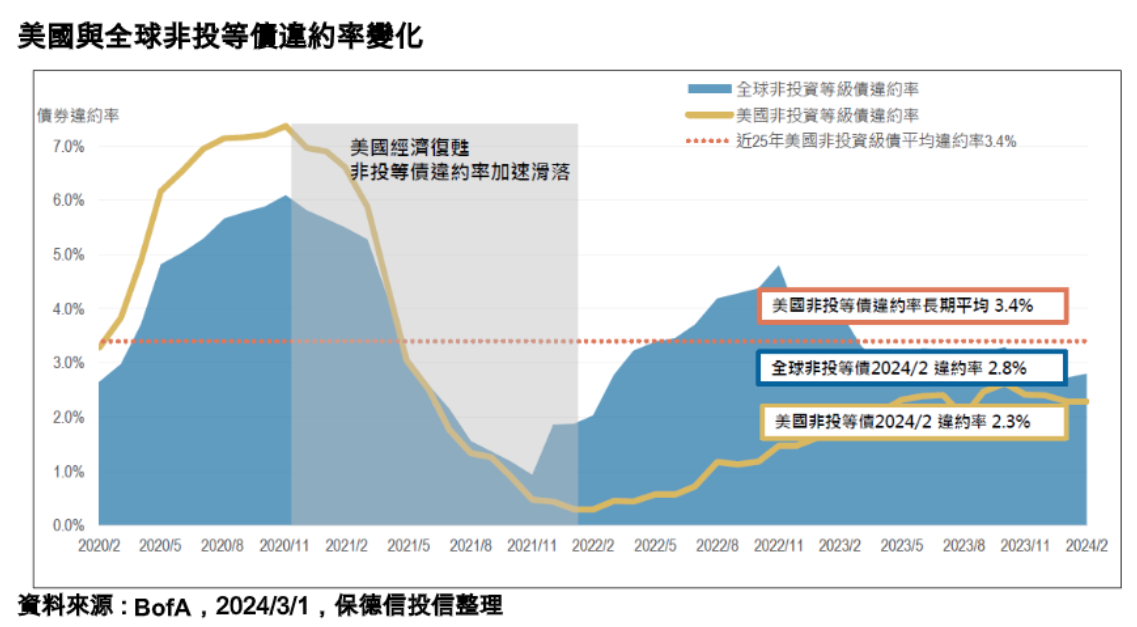 經濟有撐,非投資級債違約率遠低於平均值!保德信指出,從去年初至今,經濟數據持續顯示美國景氣具韌性,加上通膨降溫以及聯準會仍有機會降息的推動下,資金持續回流,促使美國非投資等級債信用利差已收斂至歷史相對低檔,違約率也維持低檔水位,目前僅有2.3%,低於平均值3.4%,也優於全球非投資級債的2.8%違約率。