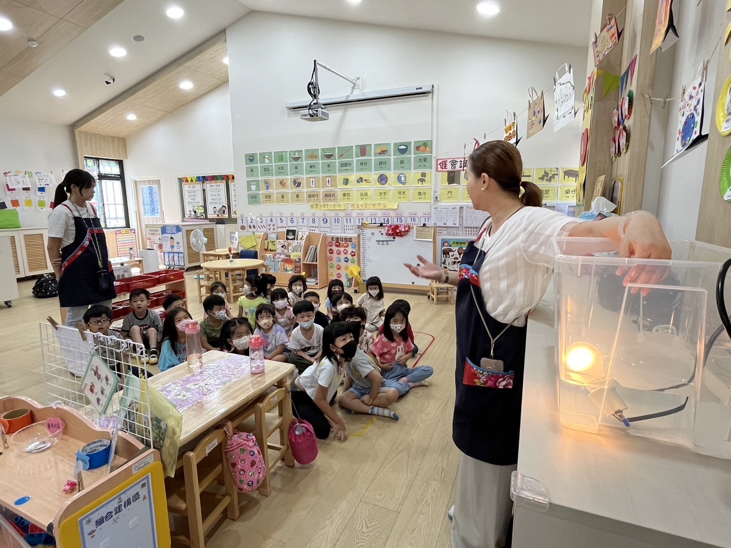 ↑圖說:幼兒園老師與廠商為孩子說明設備(圖片來源:高雄市客家事務委員會提供)