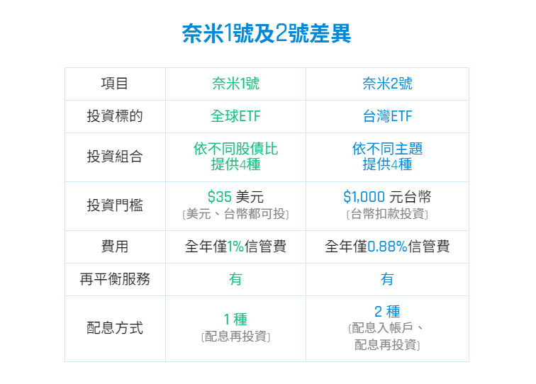 北富銀的奈米投,是幫投資人做投資組合的服務,由投資團隊選出ETF,組成一籃子ETF。其中,奈米1號佈局全球ETF,有4種組合選擇,依照投資人風險需求,可選擇股票比重高的,或是債券比重高的組合;至於奈米2號,則是聚焦台灣的ETF,有4種投資組合可選,像是「投趨勢」是以台股ETF為主,「投配息」則是以高股息ETF+債券型ETF為主。