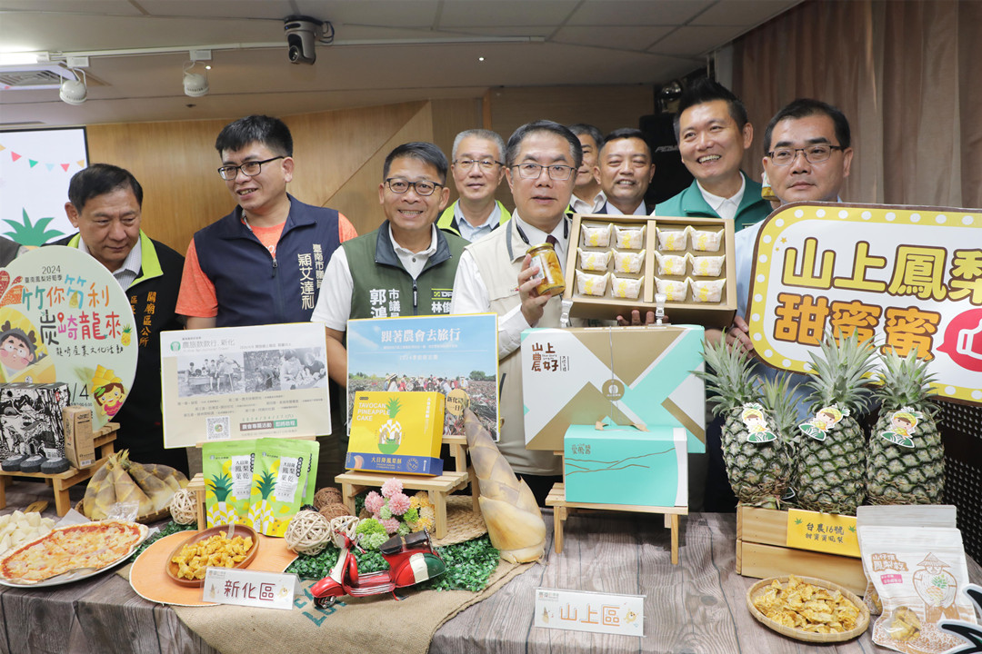 當前正值鳳梨、綠竹筍產季,台南市府日前積極開拓國內外鳳梨外銷通路。台南市長黃偉哲除赴東京食品展向日本企業推銷台南鳳梨外,也與新加坡外銷商洽談訂單、並前往板橋北銷鳳梨。台南市府日前也將鳳梨搭上綠蘆筍共同行銷,本週邀集關廟、龍崎、新化、山上等四大產區召開行銷推廣記者會,共同行銷台南特產鳳梨、綠蘆筍。台南市府宣布,首場行銷推廣活動將於本週六(4/20)在關廟山西宮廣場舉辦「2024關廟旺得福-臺南鳳梨好筍季關廟主場活動」,現場有鳳梨展售,還有手作DIY體驗、舞臺表演等精彩節目;接著在4/20、4/27則由新化區辦理休閒農業樂齡體驗營;5/4在龍崎壓軸辦理鳳梨好筍雞饗宴。