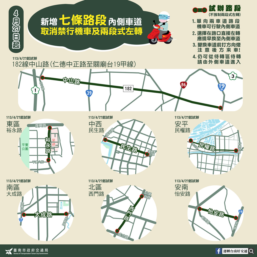 台南交通局表示,自4月27日起,交通局針對民眾較常反映的七路段,包括東區裕永路(平實八街至永康復興路)、中西區民生路(湯德章圓環至臨安路)、安平區民權路(中華西路至安北路) 、南區大成路(新都路至金華路)、北區西門路(成功路至公園北路)、安南區怡安路(安和路至長溪路)及橫跨仁德區、歸仁區、關廟區的182線中山路(仁德中正路至關廟台19甲線)進行開放,取消內側禁行機車及強制兩段式左轉,總計開放路段達17.65公里及182處路口。