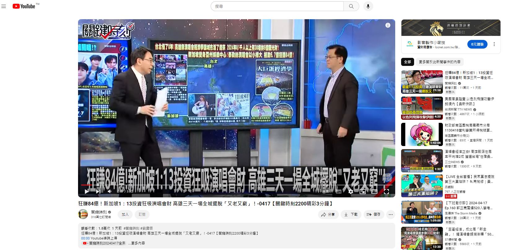 ↑圖說:《關鍵時刻》討論新加坡與高雄的演唱會經濟(圖片來源:畫面擷取自網路)