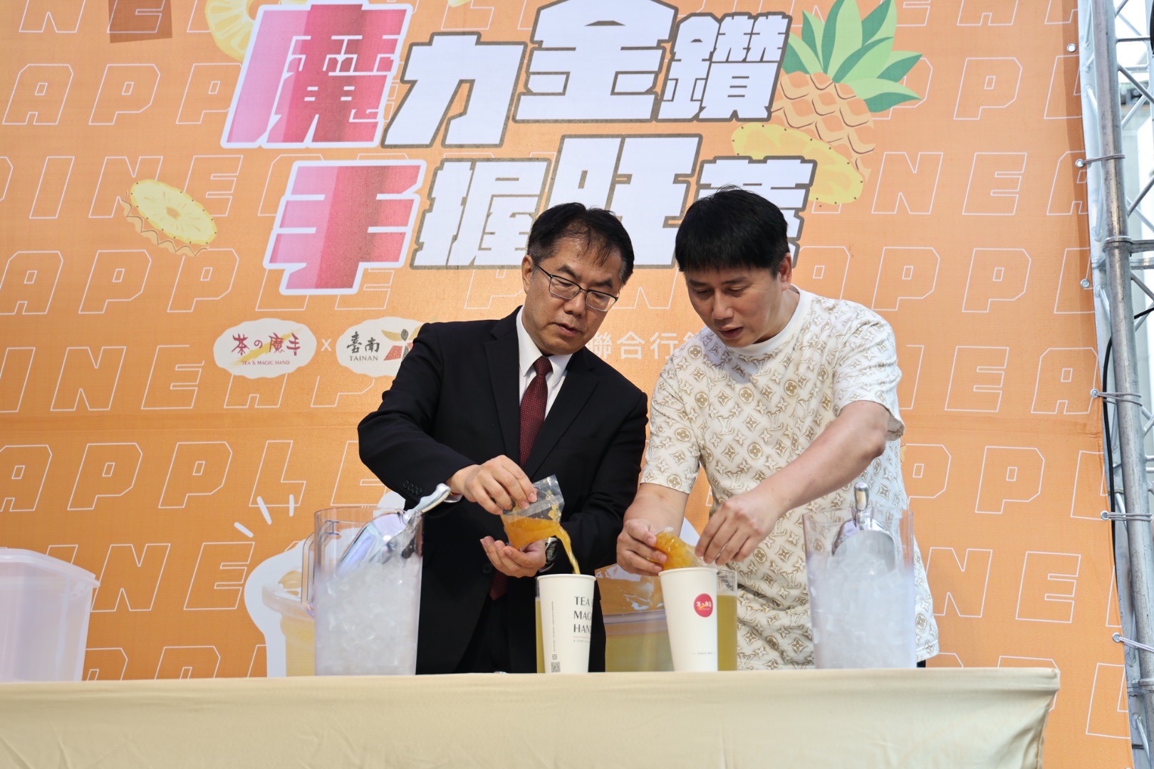 當前正值鳳梨產季,台南金鑽鳳梨夏季人氣旺!台南知名手搖飲品牌茶之魔手日前宣布認購3,000斤台南金鑽鳳梨。台南市長黃偉哲日前趕赴茶魔台北門市召開聯合推廣記者會,感謝茶魔支持台南在地農產,並應用於招牌熱銷飲品中,他邀請民眾共同品嚐台南優質農產。