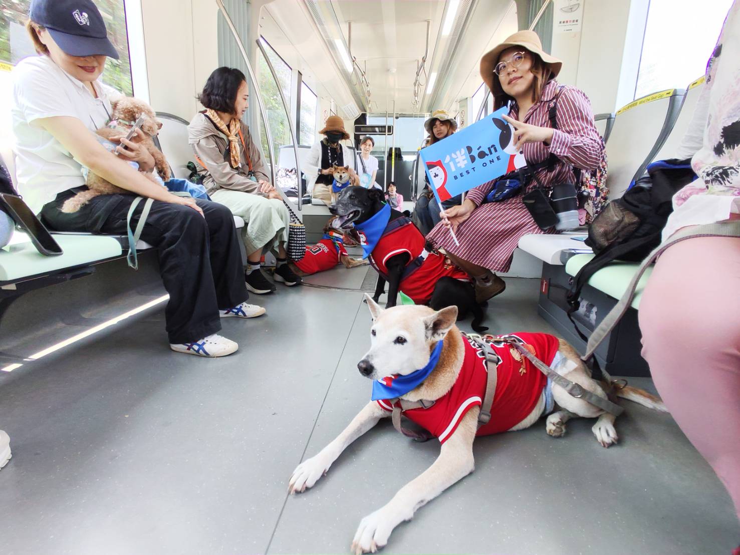 來自20組毛孩家庭的大大小小狗狗們,配戴高雄市動物友善品牌「伴bàn」圖樣的三角巾,全程穿著禮貌帶(或生理褲),在家人繫繩牽引下,依序在輕軌月台等車、上車、下車。隨著列車啟動,有的沉穩地陪伴在家人身旁,有的仰頭看著窗外沿途景色,有的瞇著眼、咧著嘴彷彿開心的模樣。不管乘車、參展、午餐期間,狗狗們都療癒十足,並引起眾人無數次歡笑!