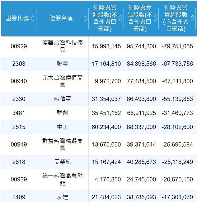 外資賣超4-10名,依序是台積電、群創、中工、群益台灣精選高息(00919)、長榮航、統一台灣高息動能(00939)、友達。
