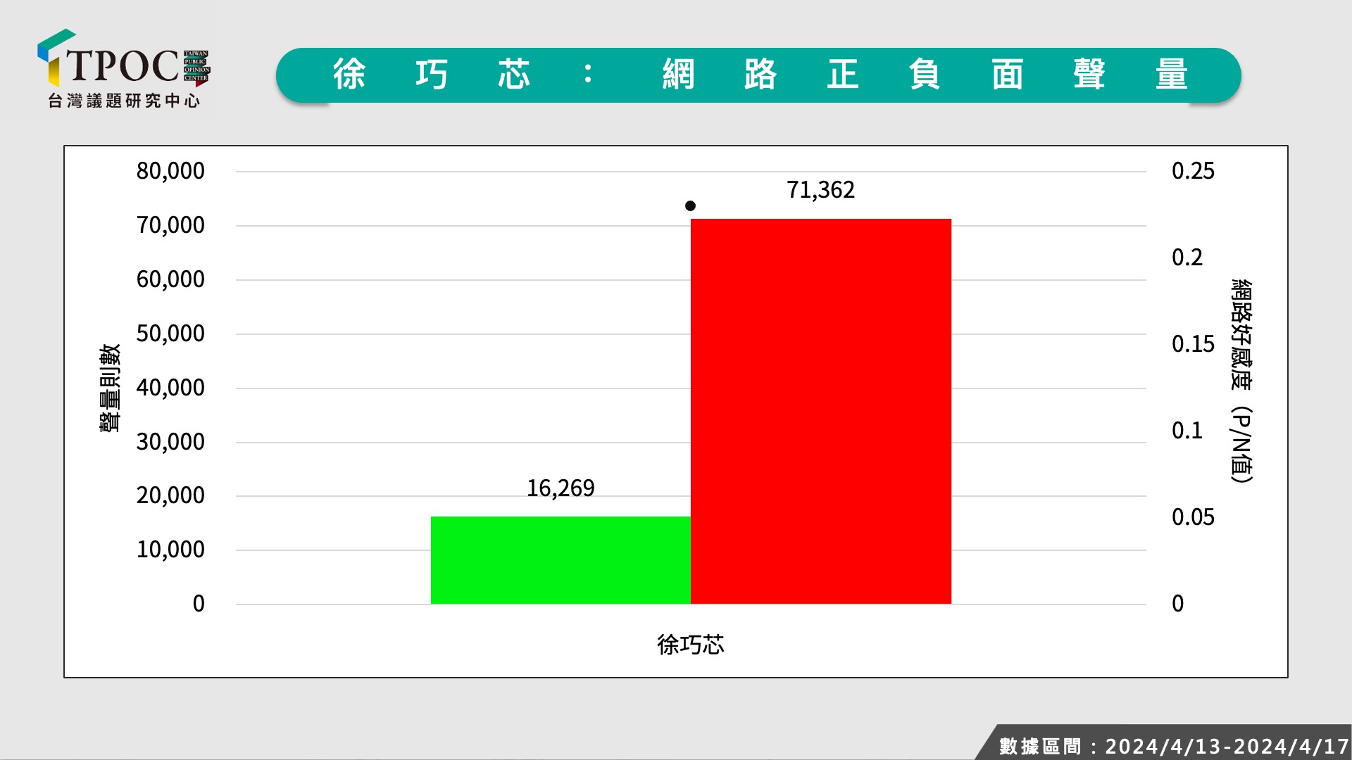 TPOC台灣議題研究中心透過QuickseeK快析輿情資料庫,搜集徐巧芯4月1日至4月16日之間的網路聲量走勢,結果發現,徐巧芯素來以擅長經營網路社群平台、揭弊、監督時政見長,在調查期間內,徐巧芯單日平均聲量高達1.5萬則,而4月中曾發生,知名實況主「統神」張嘉航不滿稱「想X未成年」被民進黨發言人吳崢評論「毛骨悚然」,兩人透過直播隔空對話,當時徐巧芯評論稱「統神的思想社會本就不需要認同,但並不犯法」,引發輿論熱議、批評,單日聲量來到超過1.3萬則高峰。