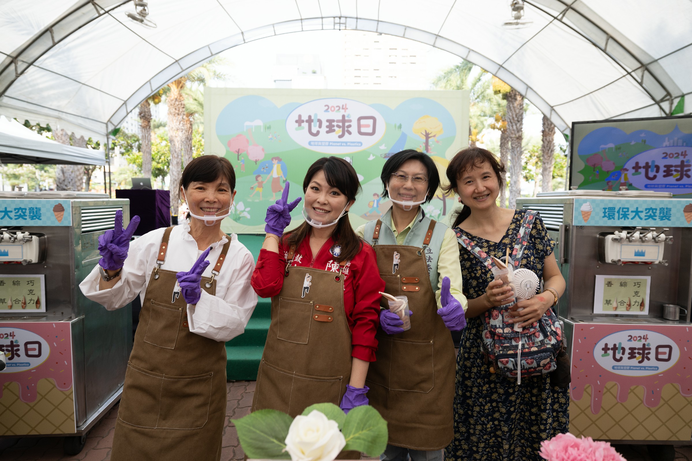 ↑圖說:環保局長張瑞琿(左1)與立委林岱樺(右2)及議員陳美雅(左2)與民眾製作冰淇淋同樂(圖片來源:高雄市環保局提供)