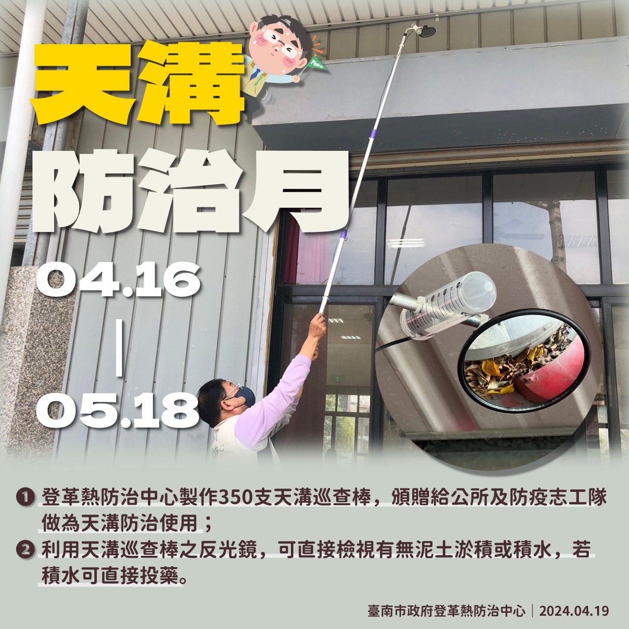 台南市府強調,據去年(112)經驗,天溝常因阻塞積水而孳生病源,市府並將4月16日至5月18日訂為天溝月,呼籲民眾每週巡察、疏通天溝,以遏阻疫情散播。為方便民眾巡視天溝,登革熱防制中心製作「天溝探測棒」,贈予公所、防疫志工隊使用,市府呼籲民眾透過探測棒提高天溝探測效率,務必在梅雨季前積極巡察,發現積水立即投藥。