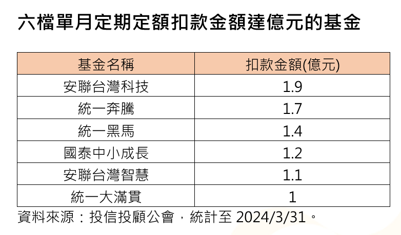 這6檔億元等級的基金,其中,有3檔是統一投信旗下基金,包括統一奔騰、統一黑馬及統一大滿貫基金,3月定期定額扣款金額分別為1.7億、1.4億及1億。另外,統一全天候基金3月定期定額扣款金額暴增23.43%至9346萬元,離億元僅一步之遙,也是十大熱門台股基金中成長最快的一檔。