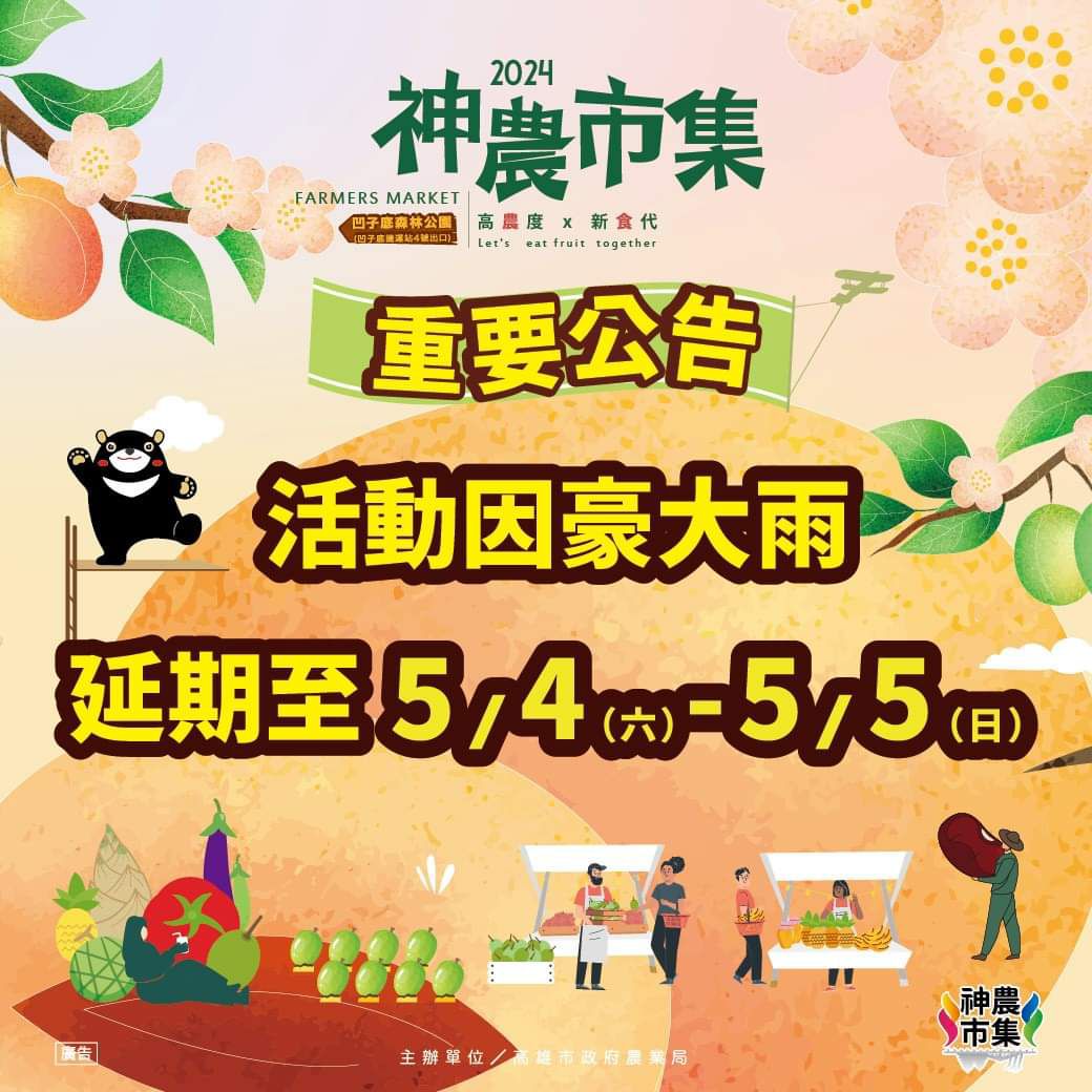現在正值青梅產季,高雄市青梅種植面積為全國之冠,原預定4月27、28在凹子底森林公園舉辦「神農市集」,因豪大雨延至5/4(六)-5/5(日)舉辦,邀請六龜區、那瑪夏區的小農到現場推廣自家種植的梅子,還有當季優質的蔬菜和水果,周末來逛市集、小採買,為家中冰箱補充新鮮蔬果。