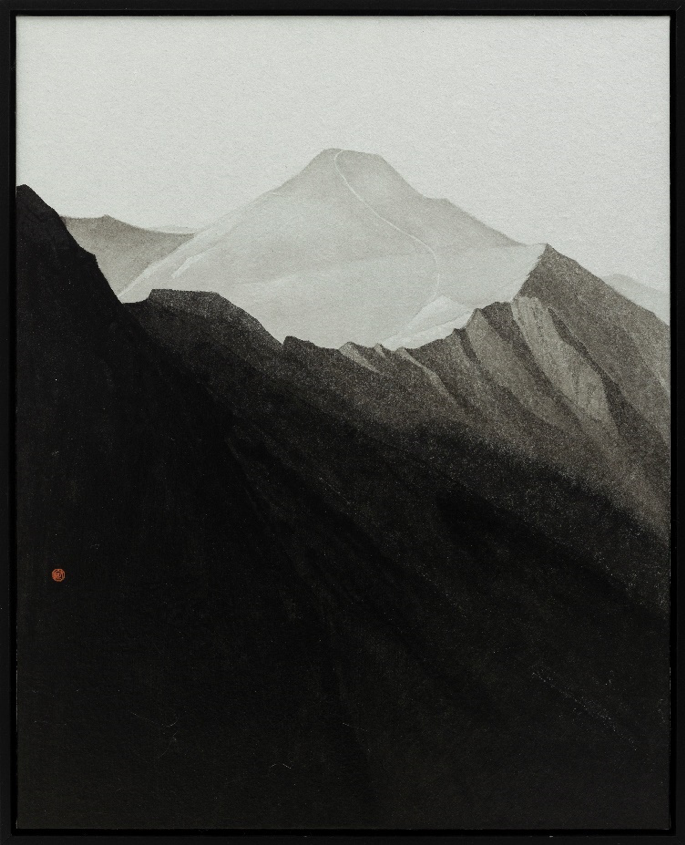 自2020開始登山以來,運用了水墨、楮皮紙及高知麻紙,來表現台灣高山上裸露銳利的山體岩塊,反覆的堆疊筆觸表現連綿的高山箭竹草原。以親身經歷的感官經驗來描述一種人的內在風景不停交流的感受,使山景描繪與自我生命產生共構的關係。