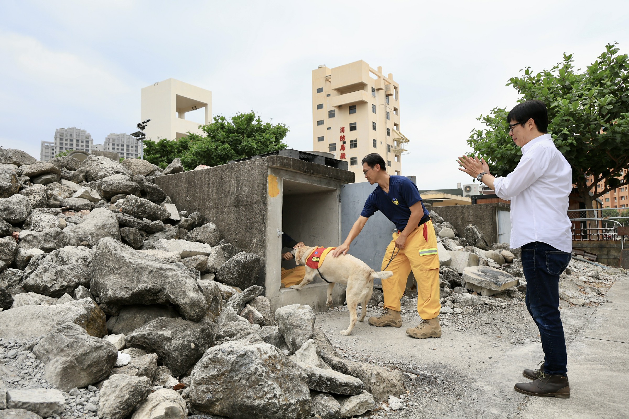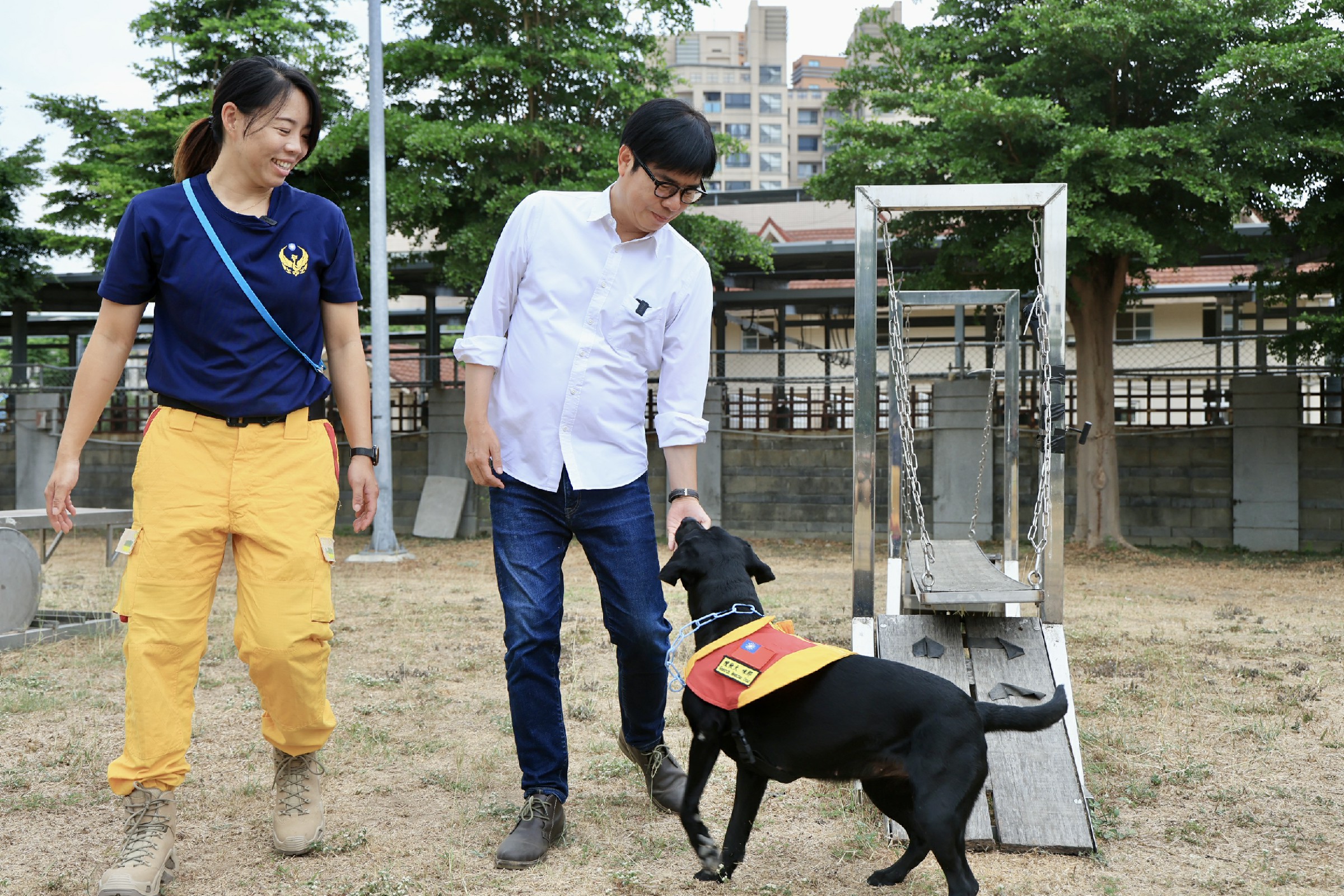 陳其邁首先體驗瓦礫堆訓練場搜索,要從三座關閉的鐵門中,透過指揮搜救犬找到待救者,這項任務由馴犬員李信宏協助,帶著搜救犬羅傑Roger引導順利完成。接著來到大草皮體驗「擺盪平台」及「拋物拾回」,分別由馴犬員鄭莛芸與搜救犬咪娜Mina、馴犬員陳孟弘與搜救犬傳八,帶著陳其邁體驗如何訓練犬隻服從性。訓練過程中搜救犬們亦步亦趨跟隨領犬員,一個手勢、一個指令,立刻完成要求動作,領犬員輕輕拍頭鼓勵、適時給予零食獎勵,牠們就雀躍不已,讓陳其邁大讚人犬的合作默契和濃厚情感。