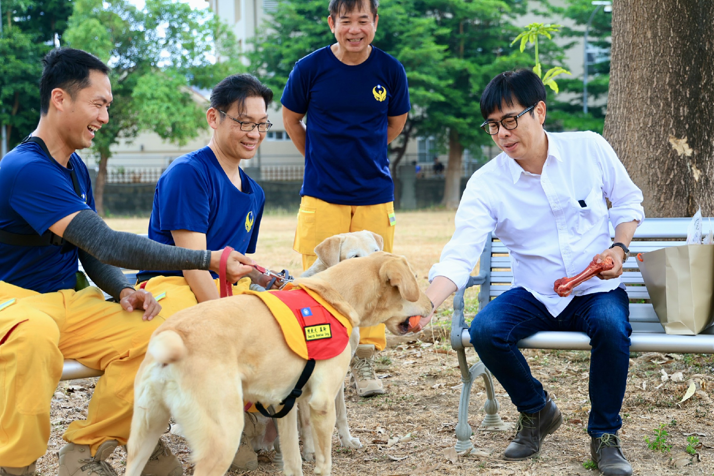↑圖說:陳其邁特地在國際搜救犬日到高雄市政府消防局搜救犬馴養中心表達關心與感謝(圖片來源:高雄市消防局提供)