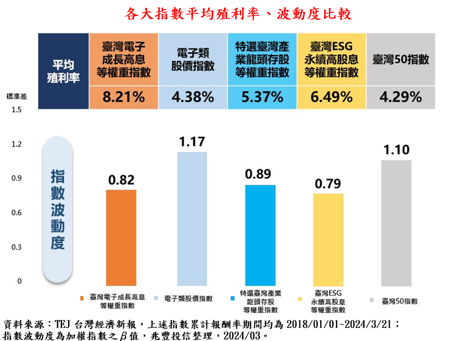 波動度來看,00943追蹤的臺灣電子成長高息等權重指數,波動度為0.82,低於電子股指數的1.17與臺灣50指數的1.1。