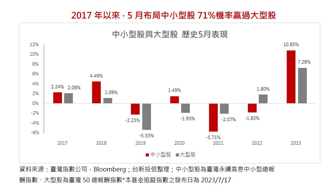 台新投信表示,時序進入五月,據Bloomberg統計,2017年以來,5月布局中小型股(以臺灣永續高息中小型總報酬指數為例),有高達71%的機率贏過布局大型股(臺灣50總報酬指數為例)。