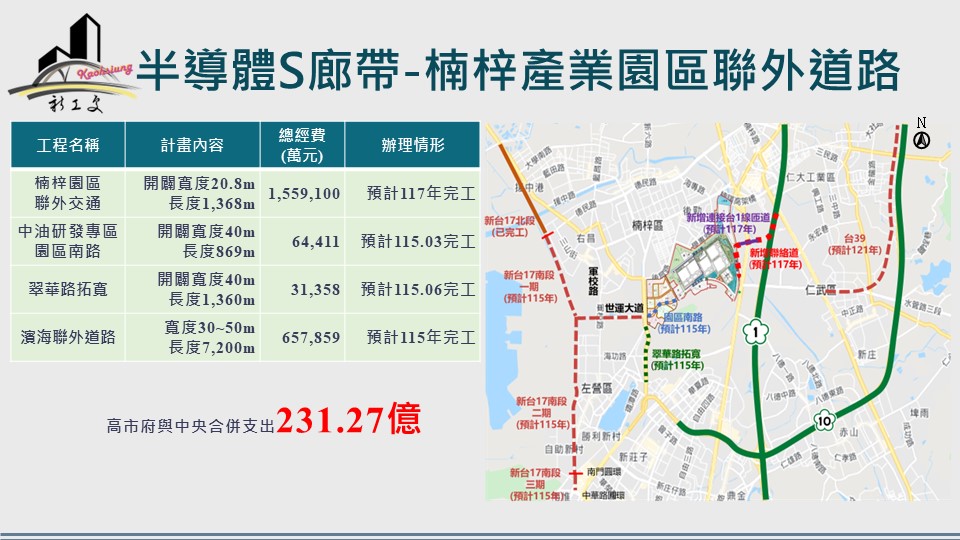楠梓產業園區在中油高煉廠轉型及台積電進駐後,高市府除了代辦中油園區南路開闢工程,並積極辦理翠華路拓寬工程及濱海聯外道路南段工程(新台十七線)外,同時與中央南科管理局合作向中央提案增設園區聯絡道計畫,中央與地方一起合作投入總經費231.27億元,目前中油園區南路開闢工程、翠華路拓寬工程及濱海聯外道路南段第一期工程刻正積極施工,預計於115年竣工通車,園區聯絡道工程建設計畫於今年已獲行政院核定,預計於117年完成。未來楠梓科學園區人流及物流的運輸更加便利。隨著橋科及楠梓產業園區產業發展,北高雄交通建設將可便利產業對外之交通和運輸,帶動周邊社區蓬勃發展。