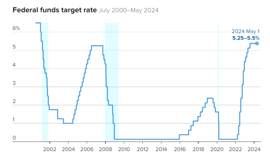 美國聯邦準備理事會(Fed)今天再度宣布利率按兵不動,維持5.25%-5.5%,符合市場預期,這是繼去年9月宣布不升息之後,連續第6次不調整利率,維持近23年(2001年初以來)的利率最高水準。聯準會主席鮑爾強調,通膨依然過高,聯準會願意按兵不動,直到通膨情勢發生變化,但他也說,下一次6月開會,不太可能升息。