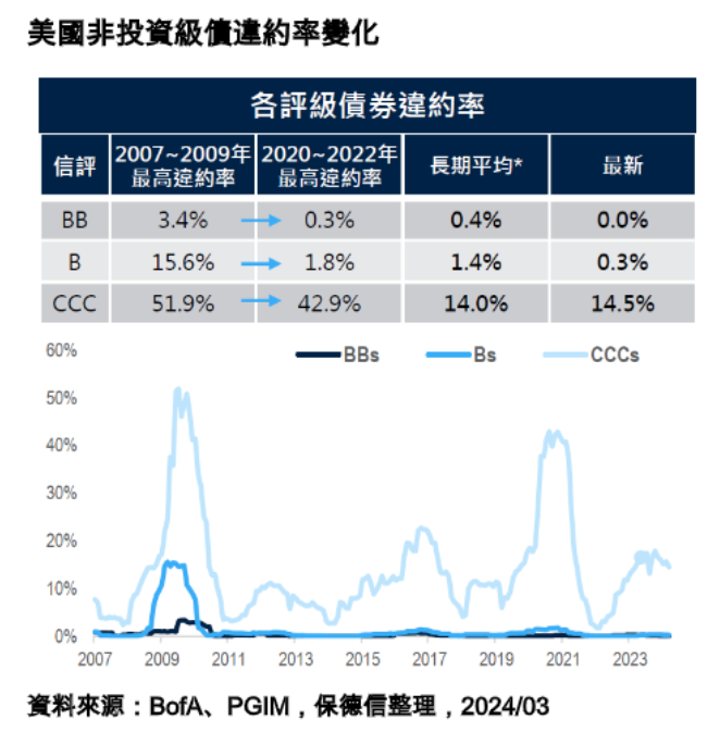 林芷麒進一步分析,美國非投資級債的「體質」已與過往大相逕庭,目前BB和B級債券合計占美國非投資級債券市場高達9成,CCC級或以下的債券比重持續下滑,整體品質較過去明顯提升,而且從違約率角度來看,過往違約風險多集中於CCC級債券,BB級長期違約僅0.4%、B級僅1.4%,若從最新的數據分析,BB級現階段甚至沒有違約,B級的違約率也只有0.3%,反映出現在的非投資級債已「轉骨」,只要慎選較高評等的債券,便能降低整體信用風險。