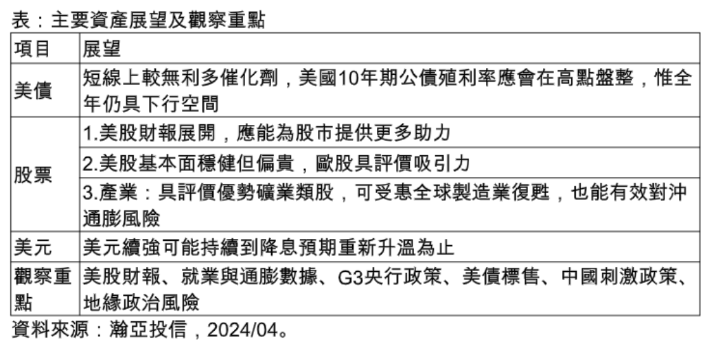 匯市部分,若高利率持續更長時間,美元強勢期將保持更久,加上若ECB(歐洲央行)於今年6月啟動降息,將有助美元指數未來數月高位震盪。後續待美聯準會釋出較明確的降息訊號後,美元將稍趨貶勢,幅度則將視未來美國降息步伐速度而定。