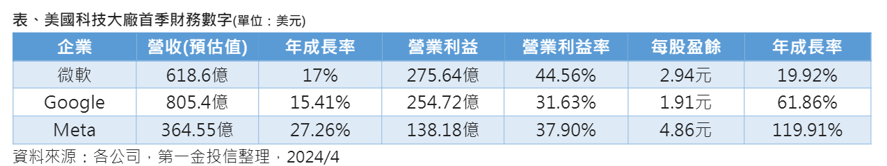 美國科技龍頭大廠首季財報普遍優於預期,激勵科技股股價近期重振雄風,展望後市,第一金全球AI人工智慧基金經理人李坤憲指出,近期科技大廠首季營收、獲利持續成長且優於預期,主要受惠AI、雲端業務高速成長,加上成本控制奏效,由於AI需求強勁,資本投資量能增加,科技大廠產能仍待擴充以滿足需求缺口,若產能提升,將有助營收獲利展望回復成長力道,整體投資前景樂觀。