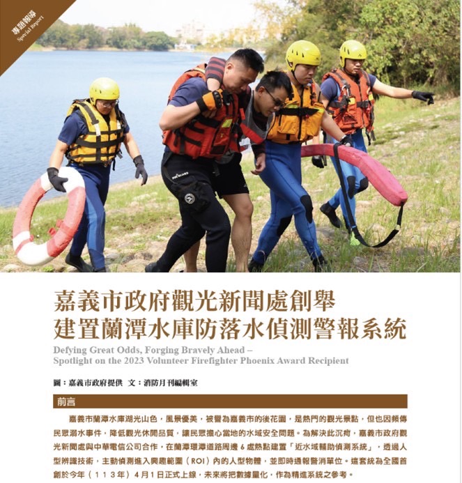 ↑圖說:消防月刊3月號封面專題報導蘭潭水庫建置「水域型智慧人形辨識系統」(圖片來源:嘉義市觀光新聞處提供)