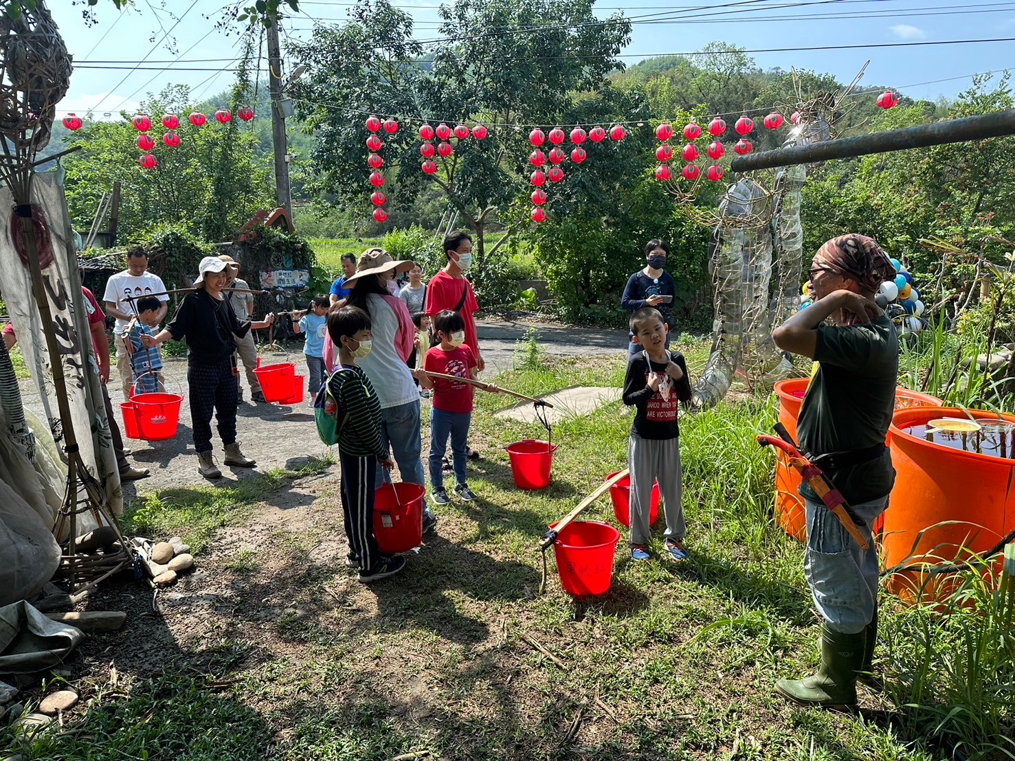 【里山生活術】傳達的是與自然一起生活的理念與實踐,由推動環境教育及農村藝術的「果然紅農藝生活」夫妻檔羅元鴻與蔡佳蓉,以客華雙語帶領參與的親子及大朋友,在美濃一處舊名「茅窩窩」的地方展開實做、及體驗「擔竿㧡水」(扁擔挑水)、「竹管引水」、「剁樵摶草結」(劈柴紮草結)及「結灶煮白湯茶」(紅磚灶煮白開水)等4種客家先民的生活方式,體會早期客家人生活智慧與辛勞,參與的大小朋友從完成任務中,也獲得了成就感。來自都會區的楊小姐表示,很開心地發現自己大都聽得懂老師的客語解說,也從中習得客語詞彙及客家生活技能與文化,有這樣的活動很珍惜。