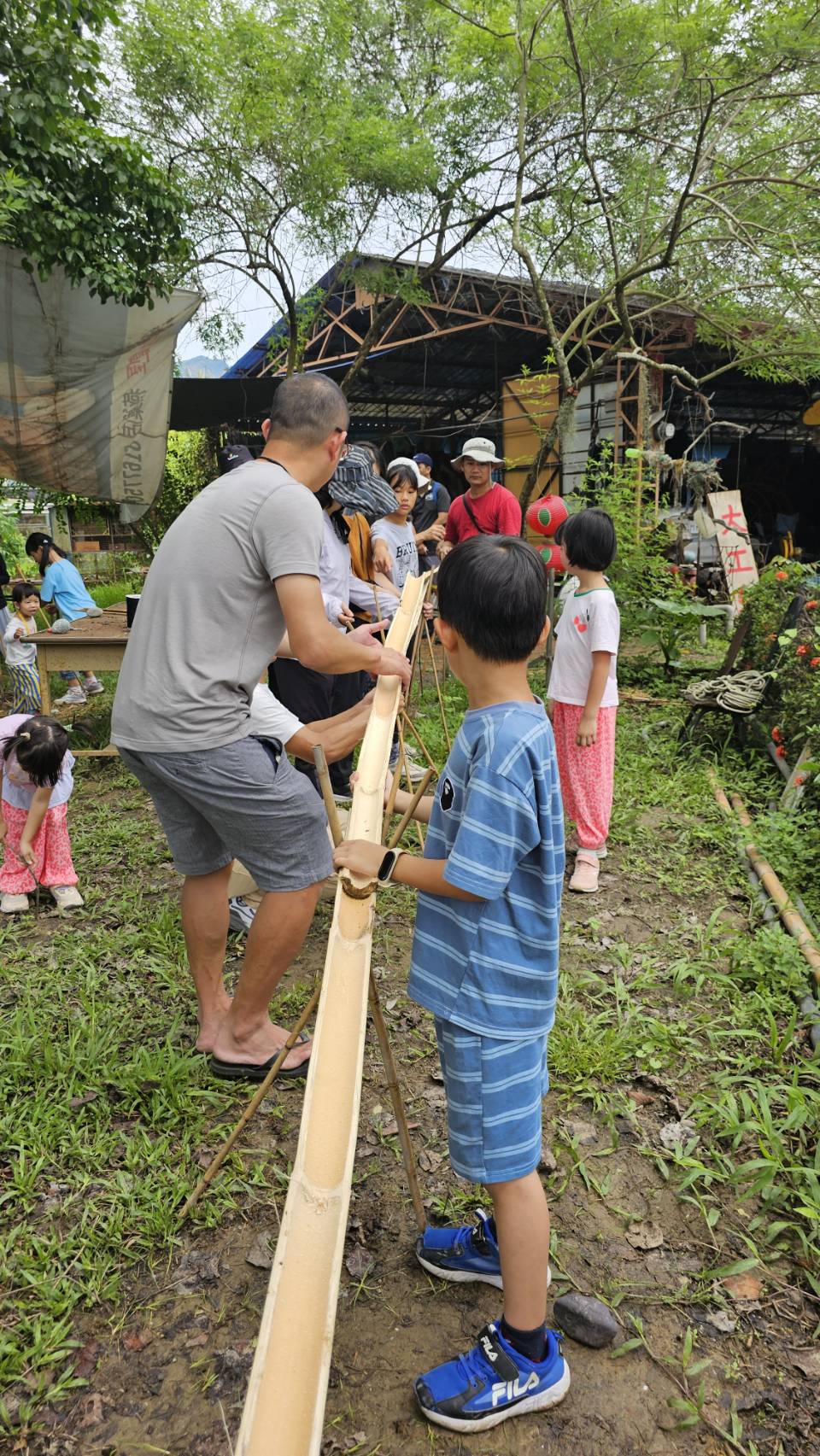 ↑圖說:大小朋友共同合作利用天然資源造出竹管水道(圖片來源:高雄市客家事務委員會提供)