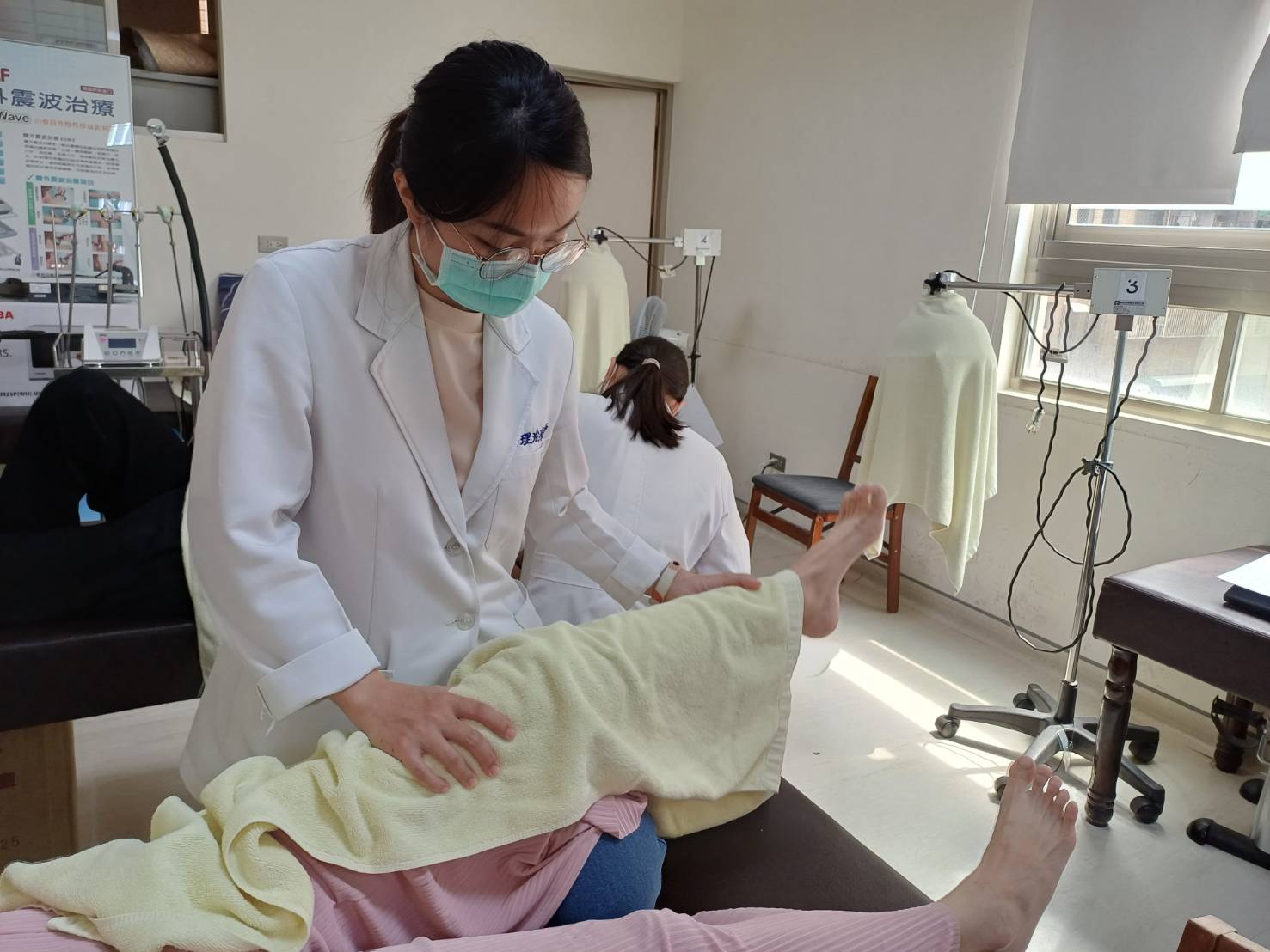 ↑圖說:物理治療師指導王小姐做股四頭肌訓練復健。(圖片來源:七賢脊椎外科提供)