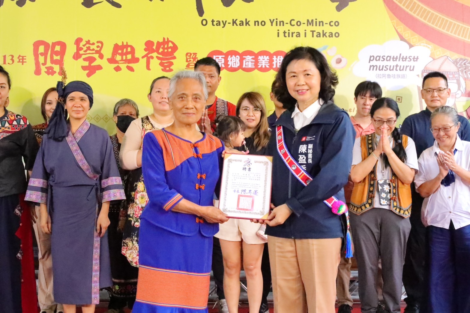 ↑圖說:高雄原住民族部落大學開學典禮 由人間國寶許春美代表21位老師獲頒教師聘書。(圖片來源:高雄市原民會提供)