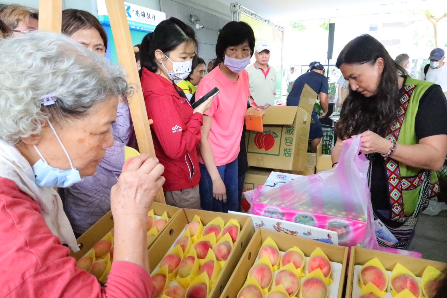 ↑圖說:高雄原住民族部落大學開學典禮現場,大批民眾搶購限量的水蜜桃。(圖片來源:高雄市原民會提供)