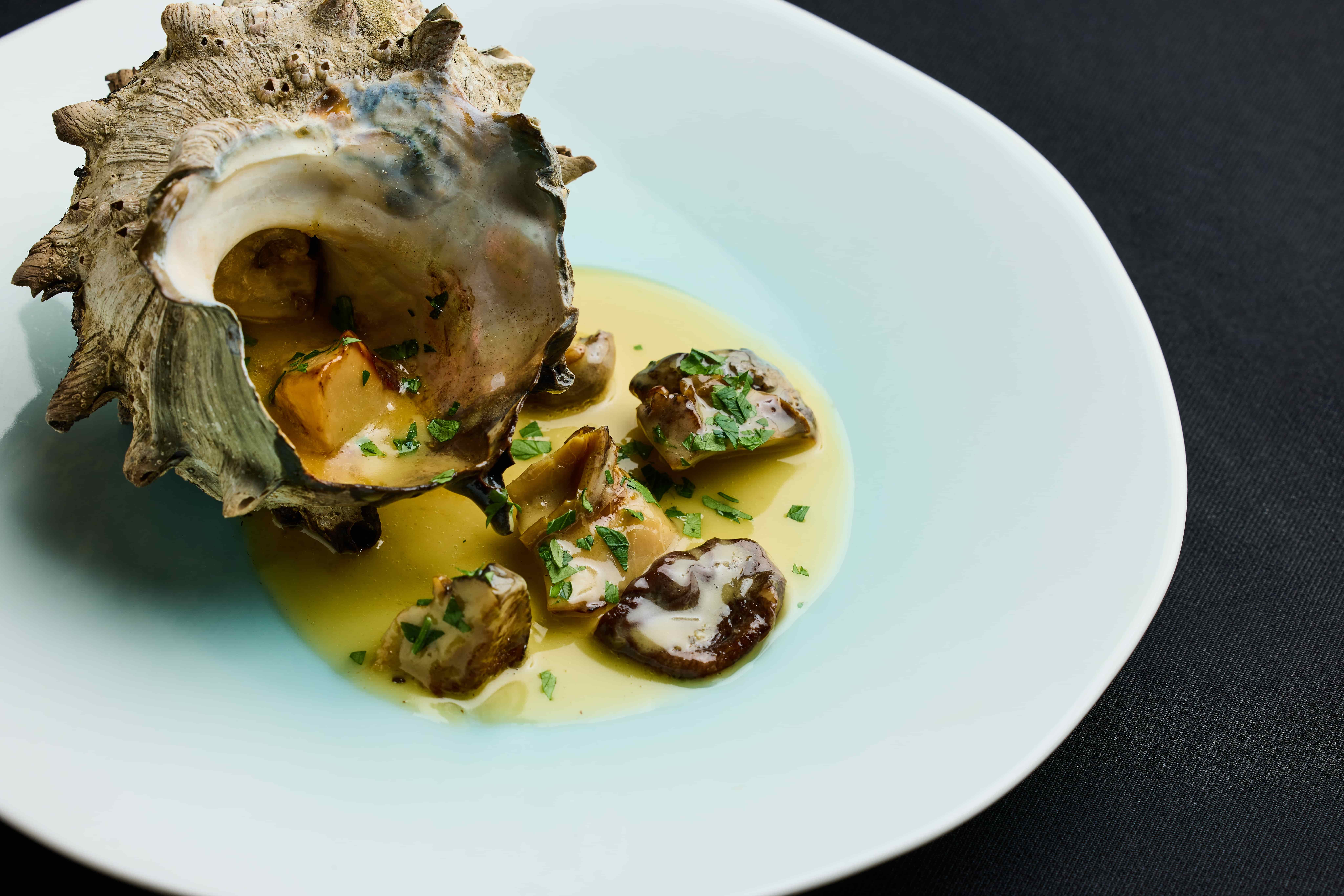 ↑圖說:「壺燒大蠑螺」奶油醬汁溫柔包裹自帶香氣的菌菇,注入蠑螺殼中一同在炭火上煨煮。(圖片來源:晶英國際行館提供)