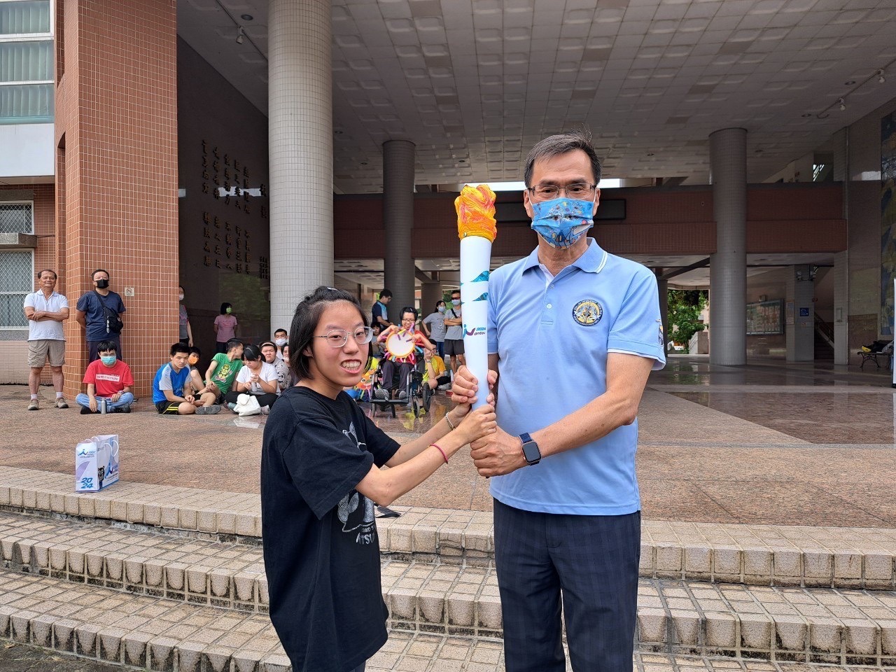 ↑圖說:高雄市楠梓特校校長黃國書(右)、特奧保齡球項目吳妍鎂選手迎接聖火。(圖片來源:高雄市運動發展局提供)