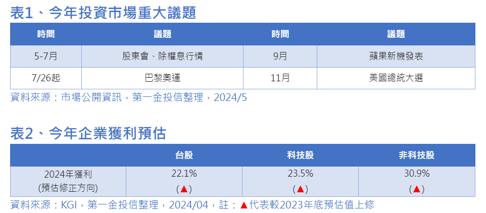 此外,觀察今年後續影響盤面變化仍有多項重大議題,第一金投信指出,近期台股在歷史高檔區間,漲多面臨震盪盤,但接著投資市場仍有多項影響行情的重大議題待發酵,像是股東會、除權息行情,7月的巴黎奧運,9月有蘋果新機發表,11月是美國總統大選等,這也預告整理後行情並不看淡,投資人宜趁跌勢早一步卡位下半年利多議題與科技應用多點開花題材等。