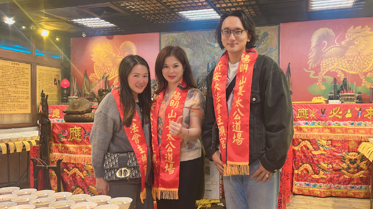 ↑圖說:不丹導演巴沃邱寧多傑(右)、賴梵耘(左)夫婦赴道場參加七星燈法會,與道場會長陳桂姍合影。(圖片來源:姜太公道場提供)