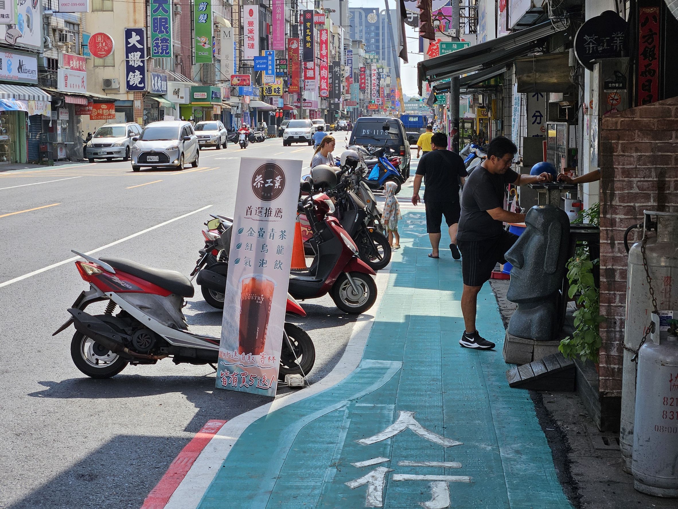 瑞隆路為前鎮及鳳山地區東西向主要道路,往西銜接一心路,可通往輕軌C1籬仔內站,兩側店家林立,尖峰時段購物、用餐人潮多,更需有合理人行空間來避免人車爭道、確保行人安全。為改善瑞隆路步行環境,經交通局多次與當地民眾、里長及民意代表溝通說明,藉由工務局道路重新刨鋪的機會,在凱旋-永豐路段將快車道瘦身縮減為3公尺,以標線規範行人專屬空間,保護行人安全的同時,也兼顧汽、機車用路人的權益。