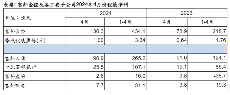 金控4月獲利全數出爐!壓軸公布的富邦金控,4月自結合併稅後淨利130.3億元,單月每股稅後盈餘(EPS)衝出約1.01元,累計前4月稅後淨利434.1億元,稅後EPS達3.34元,居金控獲利亞軍,跟國泰金同為少數EPS超過3元的獲利領先者。