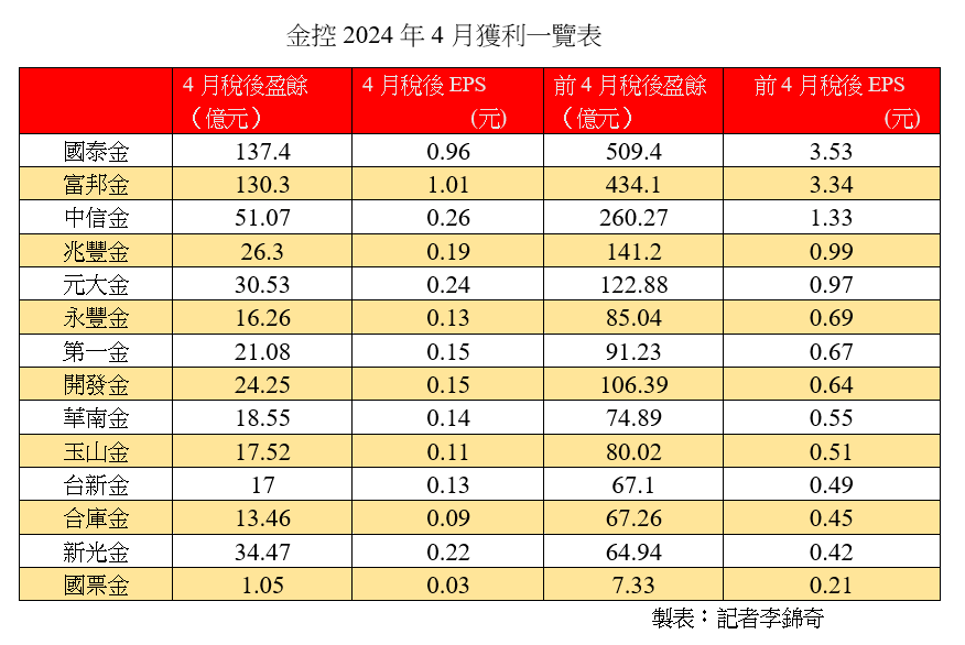 累計前四月獲利,以國泰金的296%年增率最強,其餘金控年增率普遍介於5.4%~152.6%之間。
